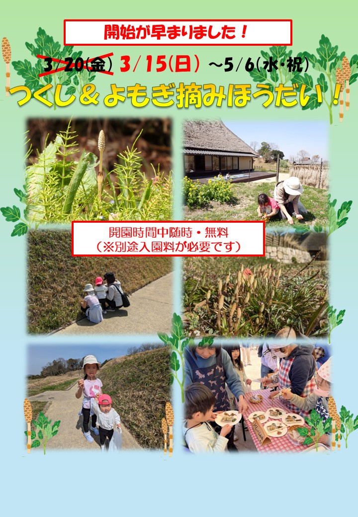 イベント 【開始が早まりました!】3/15(日)~5/6(水・祝)つくし&よもぎ摘みほうだい! |