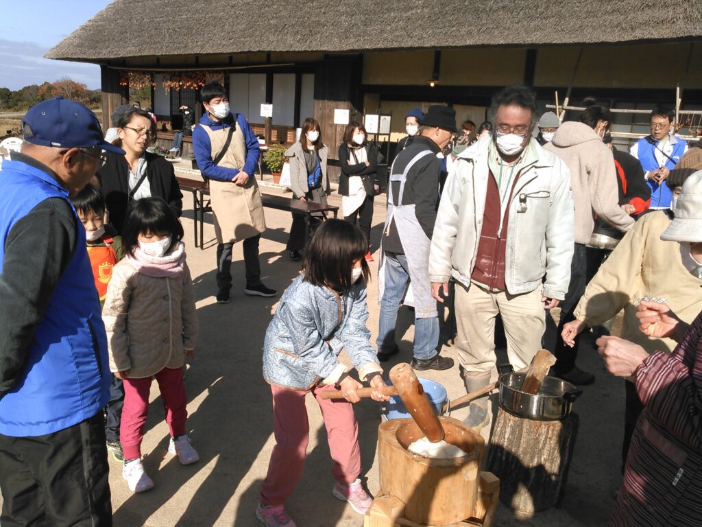 家族で餅つきしよう!つきたてのお餅でからみ餅やお雑煮、ぜんざいもいただきます♪こども用の杵と臼も用意しています。