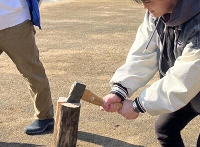 背負子をせおって丸太を運び、薪を割る「里の仕事」を体験しよう。ホクホク焼き芋もあるよ。