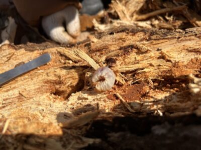 朽ち木の中や地面の下で越冬するムシたちを探そう。見つけたムシはドアップにして観察するよ。