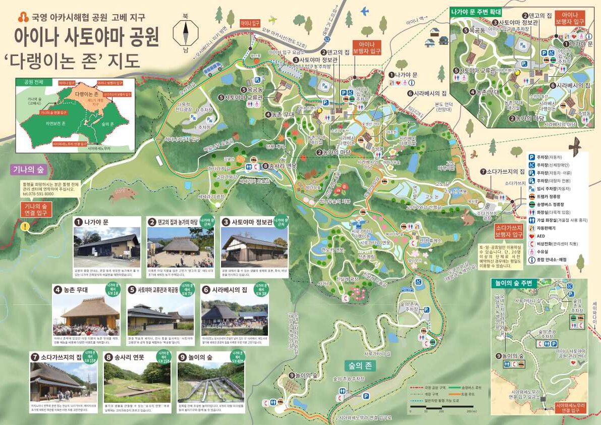 아와지 지구의 컨셉은 ‘해변의 유원공간’이고, “아이나 사토야마 공원”의 애칭으로 알려진 고베지구의 컨셉은 ‘사토치사토야마(里地里山;취락 속의 숲과 농지, 초원을 뜻함, 이하 사토야마라고도 칭함) 문화공원’입니다. 지역의 사토치사토야마의 경관을 보전 재생하여, 도시근교에서 누구나가 부담없이 사토야마를 체험할 수 있는 공원으로서, 다양한 프로그램을 제공하겠습니다.