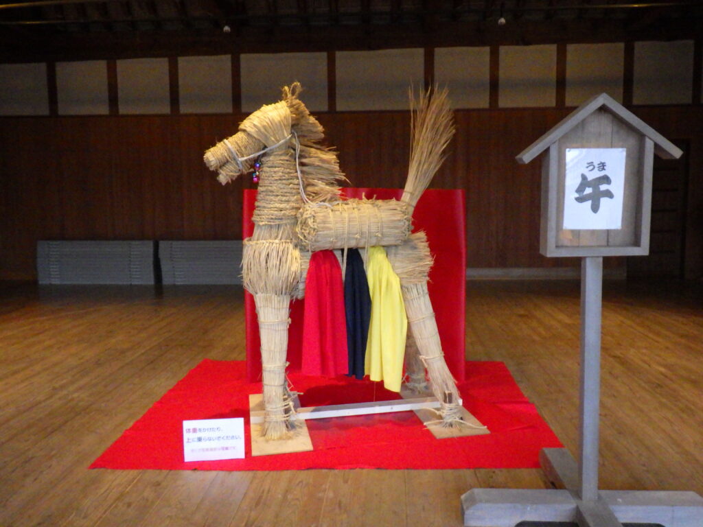 藁で作った「午」が農村舞台に登場! 骨組みは竹で、あとは藁しか使っていません。 藁の編み込みや装飾品が作成者こだわりで見どころの一つです。さらに、本物の馬くらいの大きさがあり迫力満点! 近くで軽く触れたり、写真撮影は可能ですので、ぜひ記念撮影をしてください。