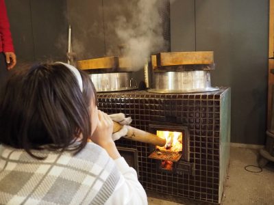 古民家内のかまどを使い、薪に火を着けるところからお湯を沸かすところまでを体験してもらいます。また、神戸のお味噌を使った味噌汁づくり体験もセット。