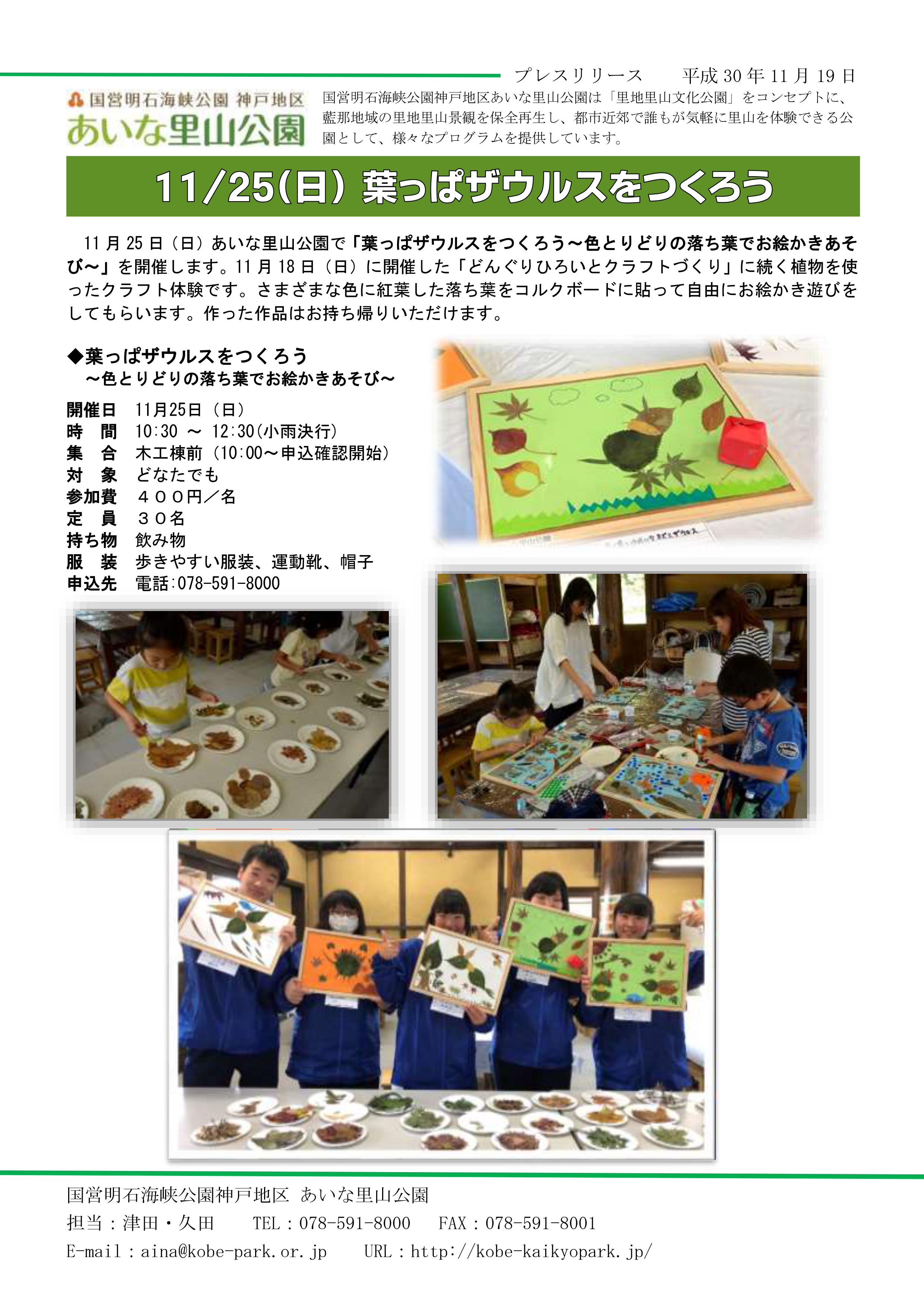 11 月25 日(日)あいな里山公園で「葉っぱザウルスをつくろう~色とりどりの落ち葉でお絵かきあそび~」を開催します。