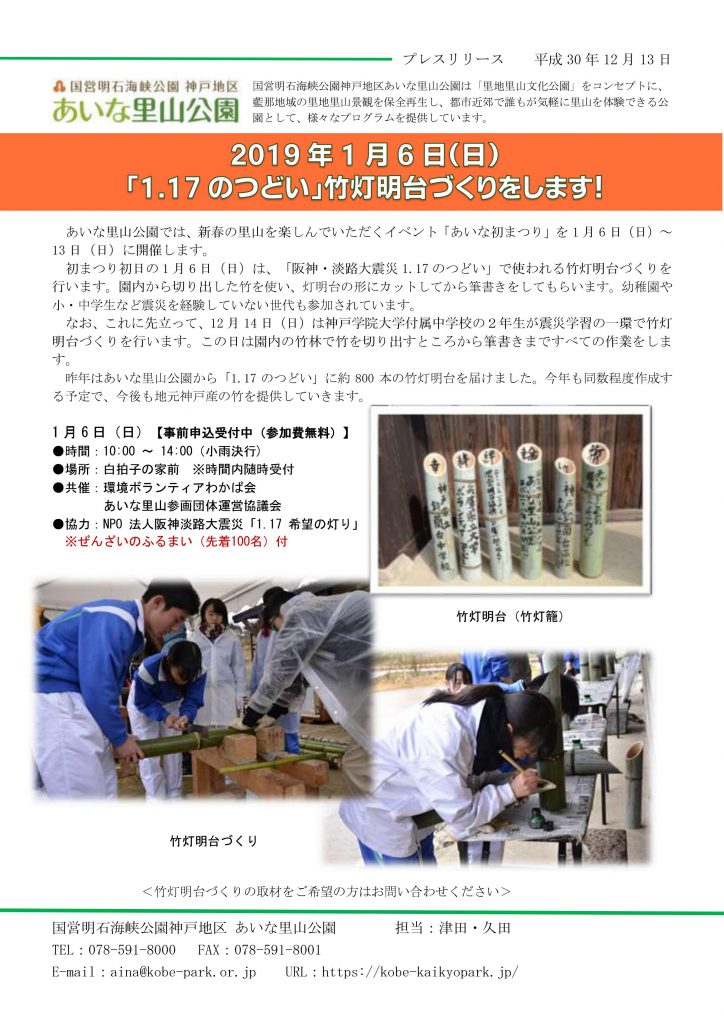 6 日には「1.17 のつどい」で灯す竹灯明台づくりを、13 日は伝統行事の「とんど焼き」を行います。