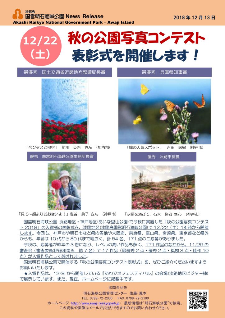 国営明石海峡公園 淡路地区・神戸地区(あいな里山公園)では、今秋に実施した「秋の公園写真コンテスト2018」の入賞者の表彰式を12月22日(土)に行います。