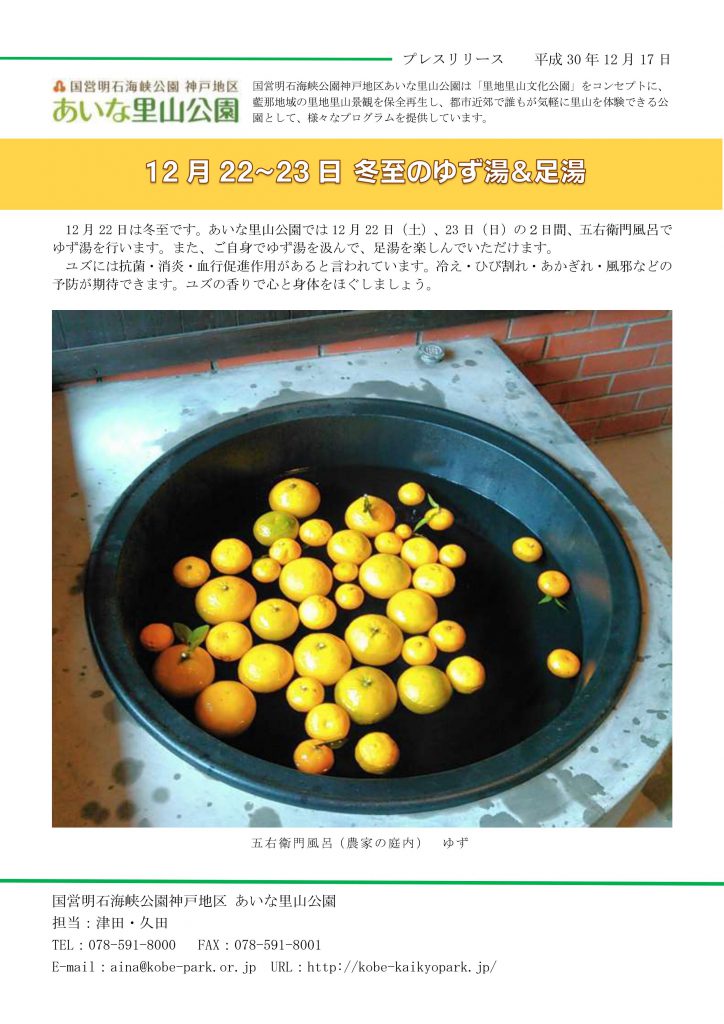 12 月22 日は冬至です。あいな里山公園では12 月22 日(土)、23 日(日)の2日間、五右衛門風呂で