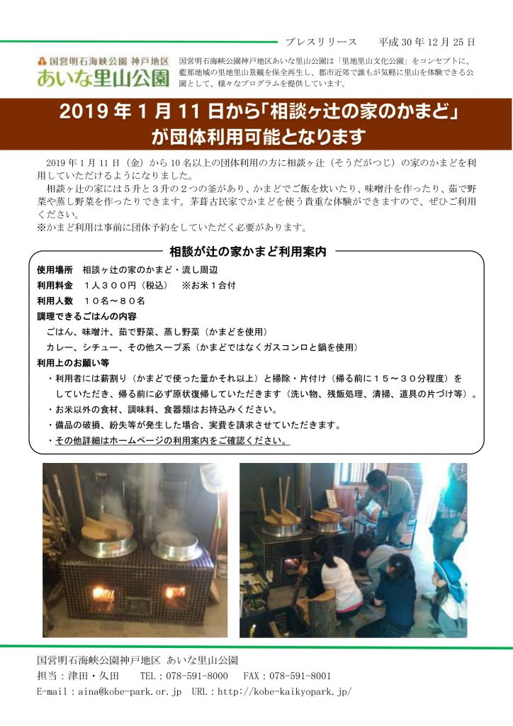 2019 年1 月11 日(金)から10 名以上の団体利用の方に相談ヶ辻(そうだがつじ)の家のかまどを利用していただけるようになりました。
