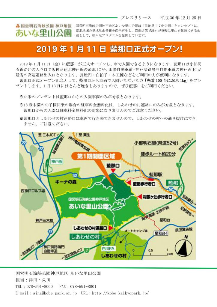 2019 年1 月11 日(金)に藍那口が正式オープンし、車で入園できるようになります。
