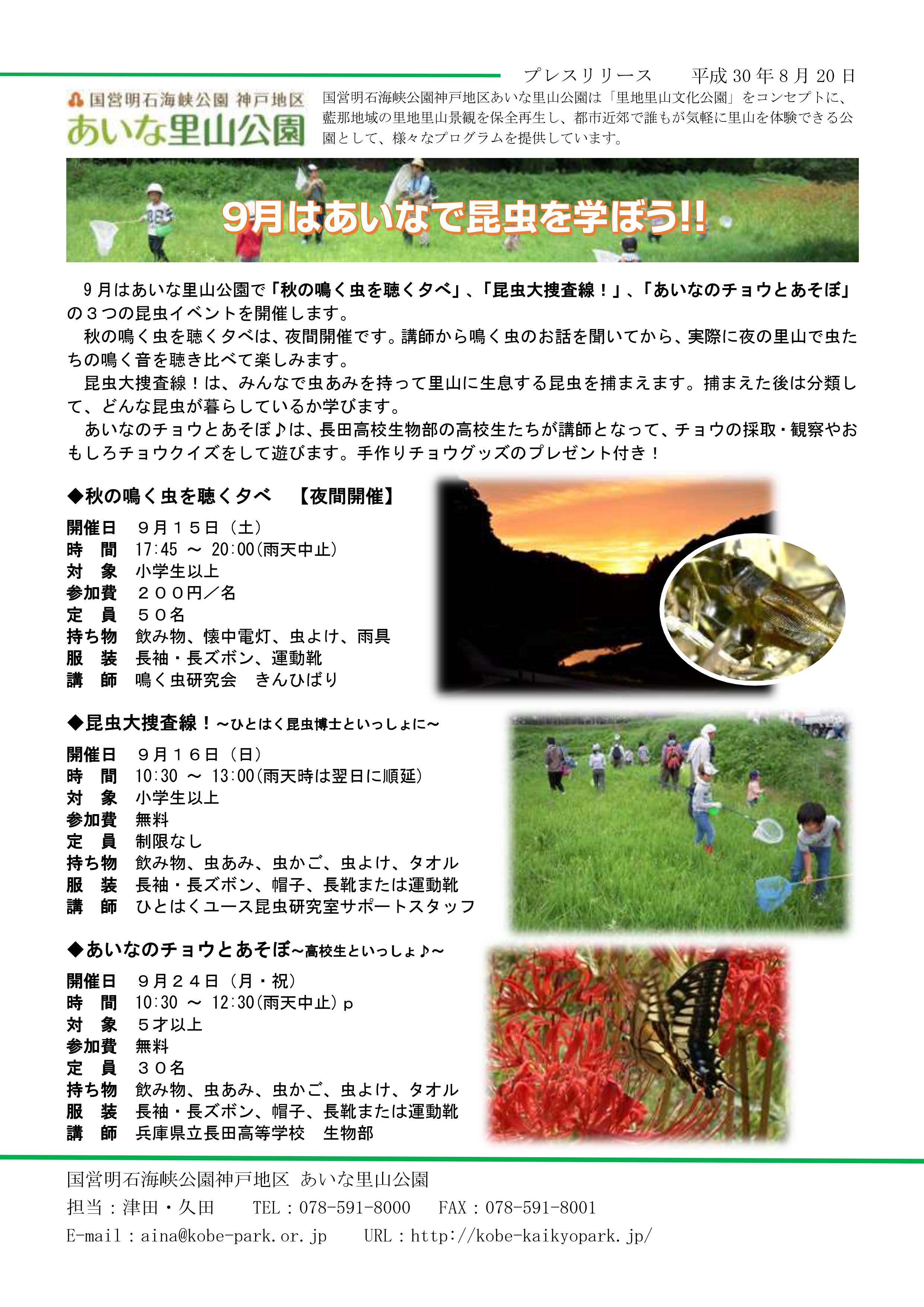 9 月はあいな里山公園で「秋の鳴く虫を聴く夕べ」、「昆虫大捜査線!」、「あいなのチョウとあそぼ」の3つの昆虫イベントを開催します。