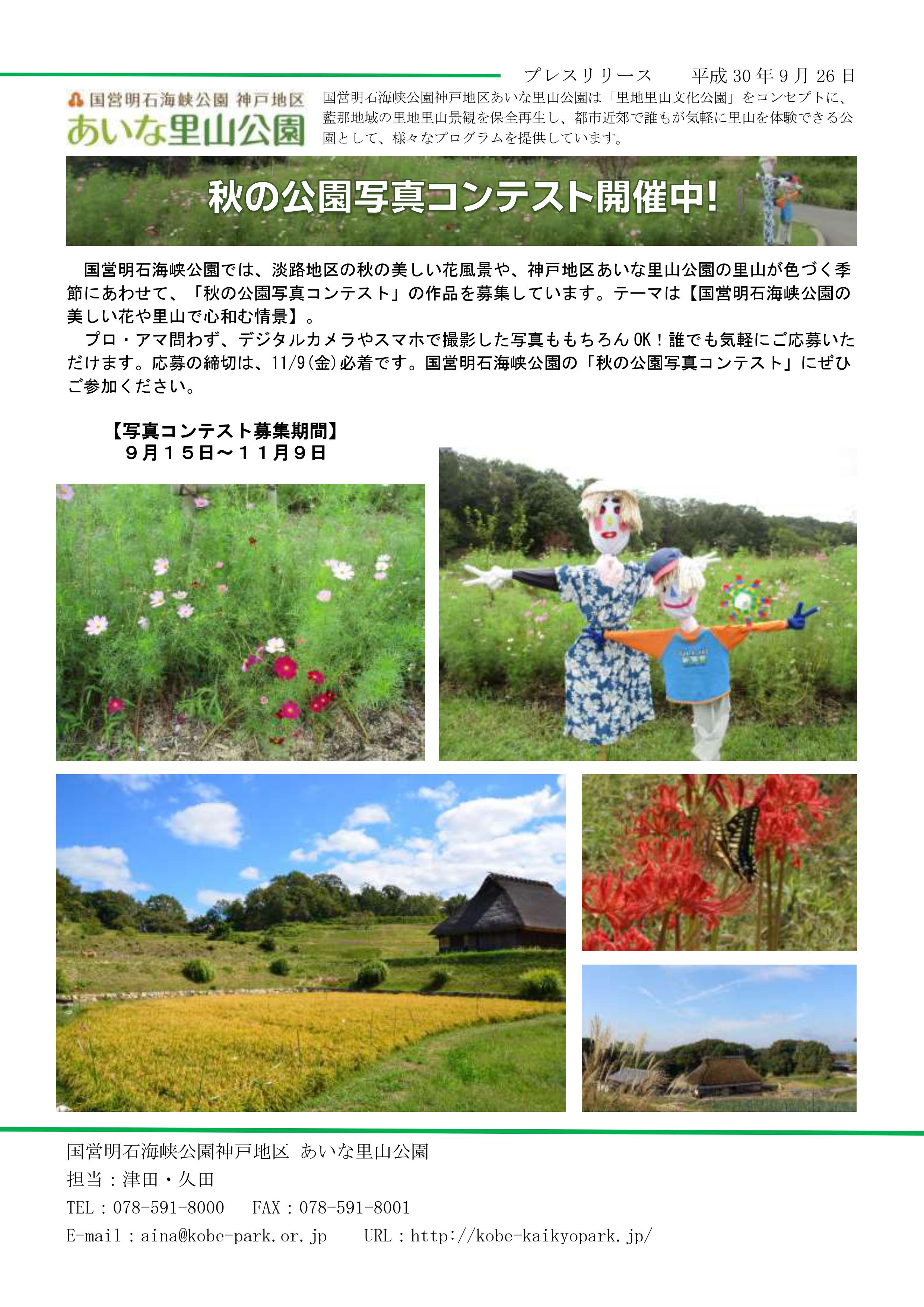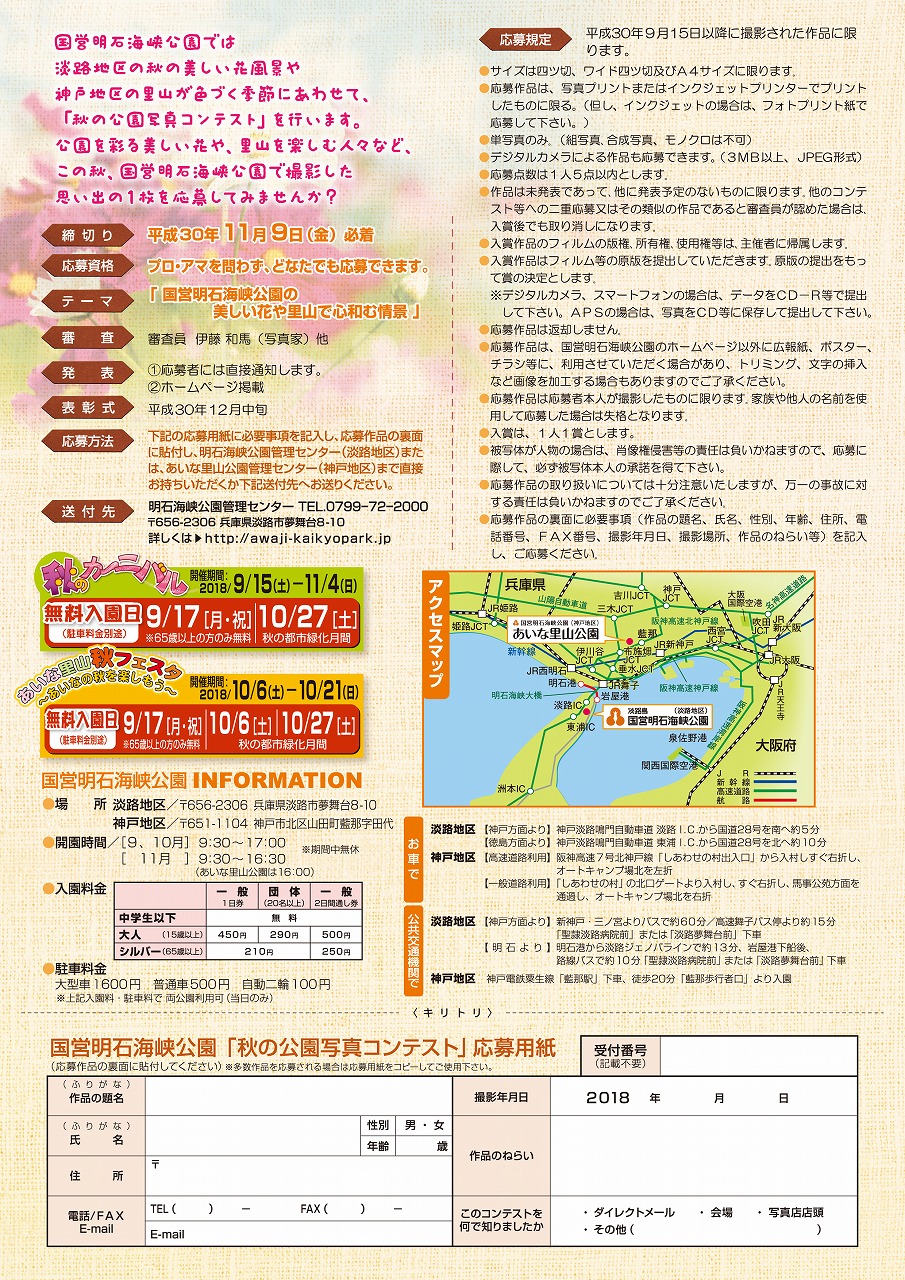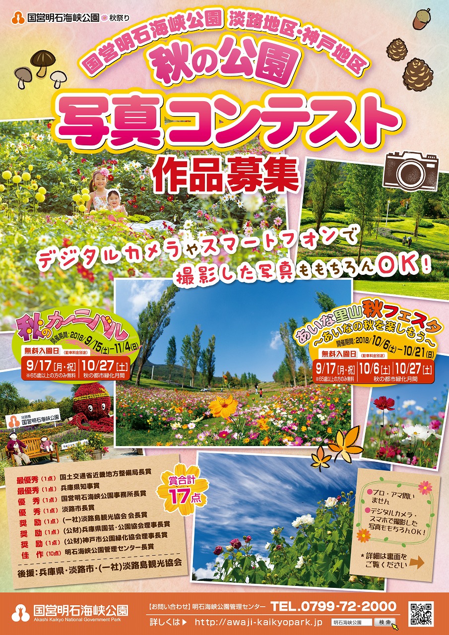 国営明石海峡公園では、淡路地区の秋の美しい花風景や、神戸地区あいな里山公園の里山が色づく季節にあわせて、「秋の公園写真コンテスト」の作品を募集しています。