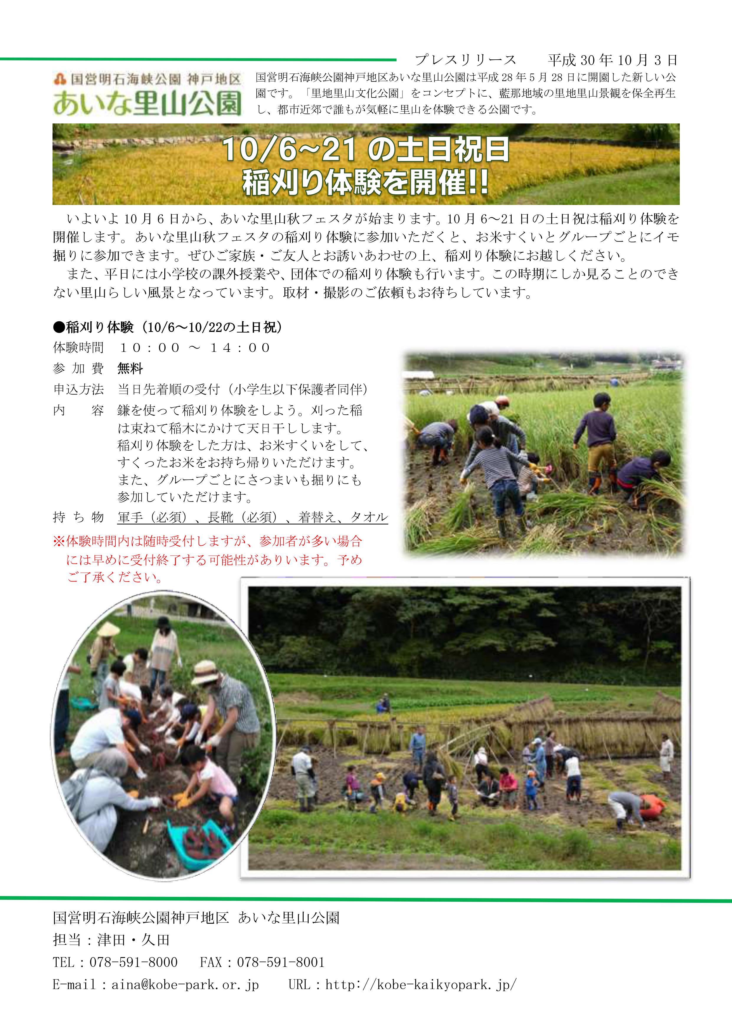 10 月6 日~21 日の「あいな里山秋フェスタ」では期間中の土日祝に当日受付で稲刈り体験ができます。