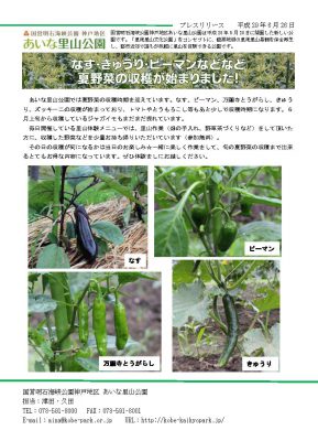 あいな里山公園では夏野菜の収穫時期を迎えています。なす、ピーマン、万願寺とうがらし、きゅうり、ズッキーニの収穫が始まっており、トマトやとうもろこし等もあと少しで収穫時期になります。6月上旬から収穫しているジャガイモもまだまだ採れています。