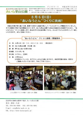 田植え作業が落ち着いた頃、藍那では昔から伝統行事として「うどんまつり」が開催されていました。今では藍那小学校で毎年開催されています。あいな里山公園でも地元の伝統文化を継承するために、“あいなうどん”づくりに挑戦します。地元の方々のお話を聞いてから、みんなでうどんを手作りして一緒にいただきます。ぜひご参加ください。