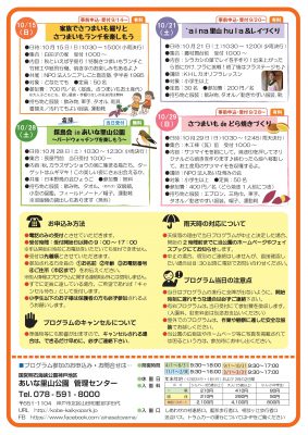 10 月のあいな里山公園は、“あいな里山秋フェスタ”の真っただ中。22 日までの土日祝は稲刈り体験ができます。稲刈り体験をした子供たちはサツマイモの収穫体験もできます。