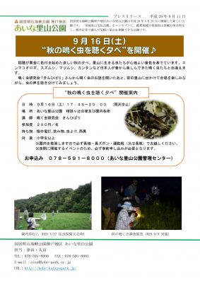 稲穂が黄金に色付き始めた涼しい秋の夕べ。里山に生きる虫たちが心地よい音色を奏でています。エンマコオロギ、スズムシ、マツムシ、カンタンなど日本人が昔から楽しんできた鳴く虫たちと出逢えます。