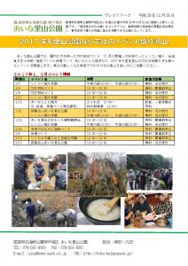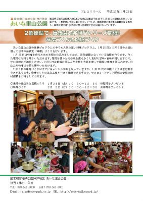 あいな里山公園では、園内の竹を使った竹灯明台づくり、12 月に開催し大好評だったレンコン掘り、伝統食を学ぶ米糀・塩糀づくりと味噌づくり、あいなとんど焼きなど、2017 年も里地里山の文化を体験できる様々なイベントを開催します。