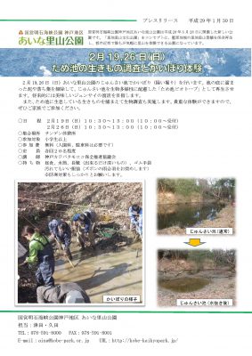 2月19,26日(日)あいな里山公園のじゅんさい池でかいぼり(掻い堀り)を行います。池の底に溜まった泥や落ち葉を掃除して、じゅんさい池を生物多様性に配慮した「ため池ビオトープ」として再生させます。将来的には美味しいジュンサイの復活を目指します。
