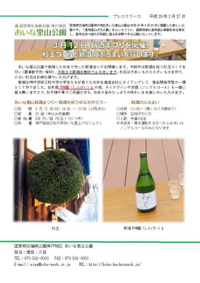 あいな里山公園で栽培したお米で作った新酒まつりを開催します。午前中は新酒を祝う杉玉づくりを行い(要事前予約・有料)、午後から新酒を無料でふるまいます。杉玉は大きいものと小さいものを作り、小さい杉玉はお持ち帰りいただけます。