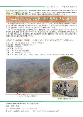 3月12日の「水辺の生きもの観察会」では、講師と共にニホンアカガエルとカスミサンショウウオの卵を探します。観察会の頃にはオタマジャクシも見られるかもしれません。二十四節気も立春となり、少しずつ暖かくなり始め、春の陽気を感じられる気持ちの良い季節となっております。ぜひ散歩をしながら園内の自然を楽しみにご来園ください。