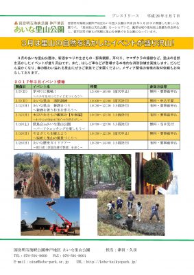 3月のあいな里山公園は、新酒まつりや生きもの・野鳥観察、茅刈り、ヤマザクラの植樹など、里山の自然を活かしたイベントが盛り沢山です。