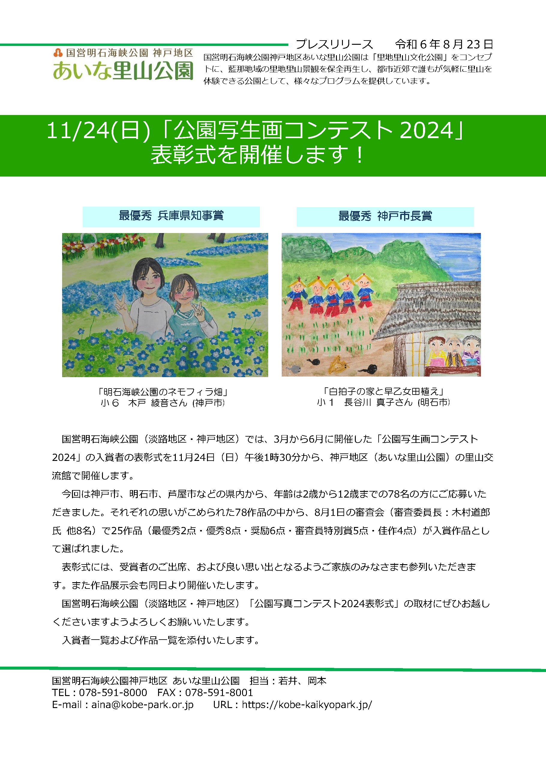 国営明石海峡公園では、今春に実施した国営明石海峡公園淡路地区・神戸地区「公園写生画コンテスト2023」の入賞者の表彰式を、11月24日(日)午後1時30分から、神戸地区(あいな里山公園)の里山交流館で開催します。