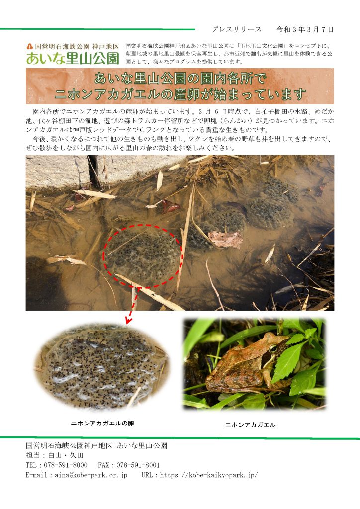 園内各所でニホンアカガエルの産卵が始まっています。3月6日時点で、白拍子棚田の水路、めだか池、代ヶ谷棚田下の湿地、遊びの森トラムカー停留所などで卵塊(らんかい)が見つかっています。ニホンアカガエルは神戸版レッドデータでCランクとなっている貴重な生きものです。