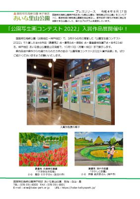 国営明石海峡公園(淡路地区・神戸地区)で、3月から6月に開催した「公園写生画コンテスト2022」で入賞した全46作品(最優秀2 点・優秀8点・奨励6 点・審査員特別賞7点・佳作23点)を、あいな里山公園里山交流館で、10月10日(月曜・祝日)まで展示します。