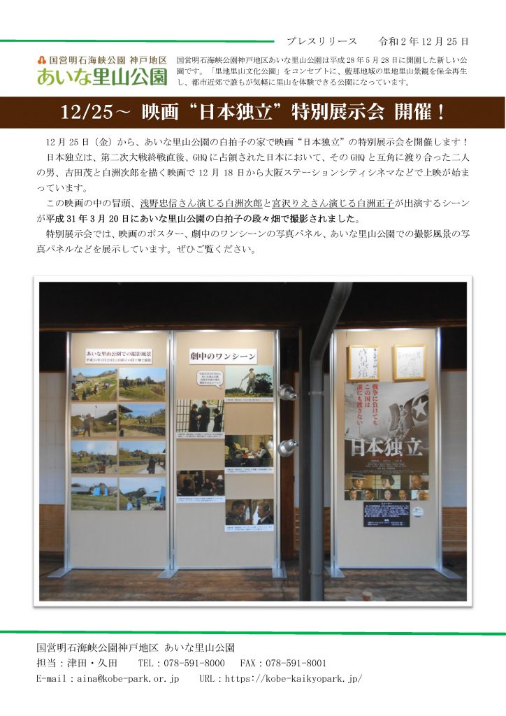 12月25日(金)から、あいな里山公園の白拍子の家で映画“日本独立”の特別展示会を開催します!