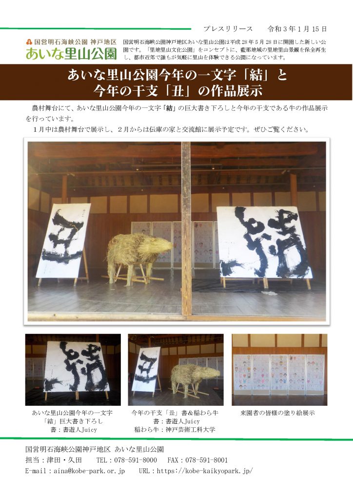 農村舞台にて、あいな里山公園今年の一文字「結」の巨大書き下ろしと今年の干支である牛の作品展示を行っています。