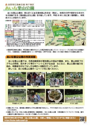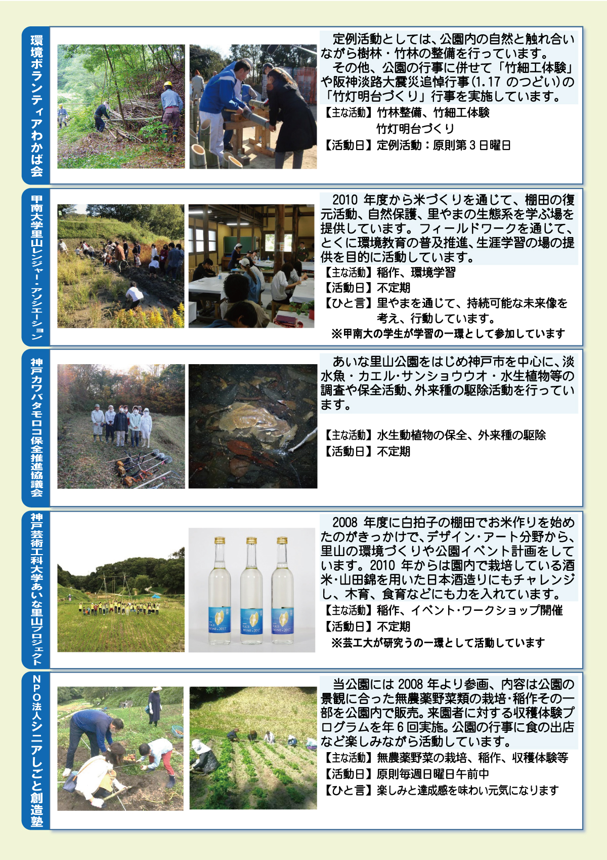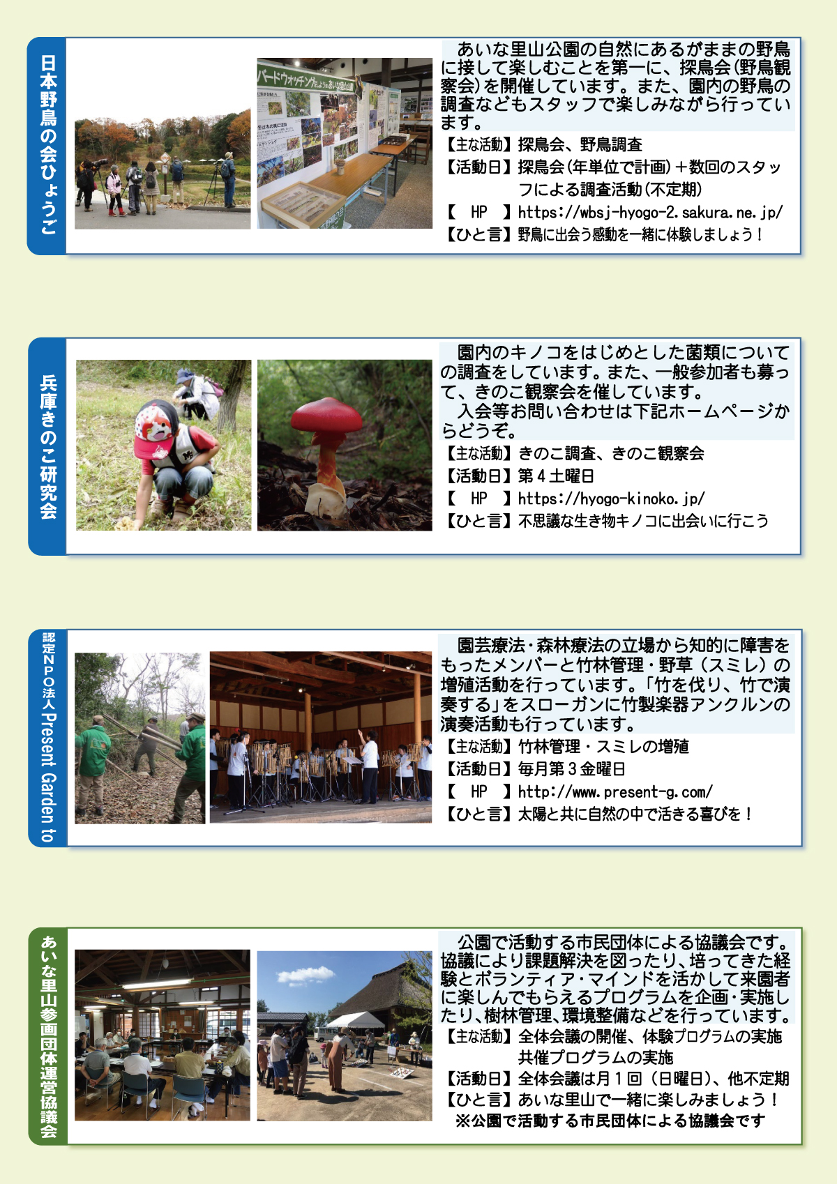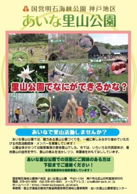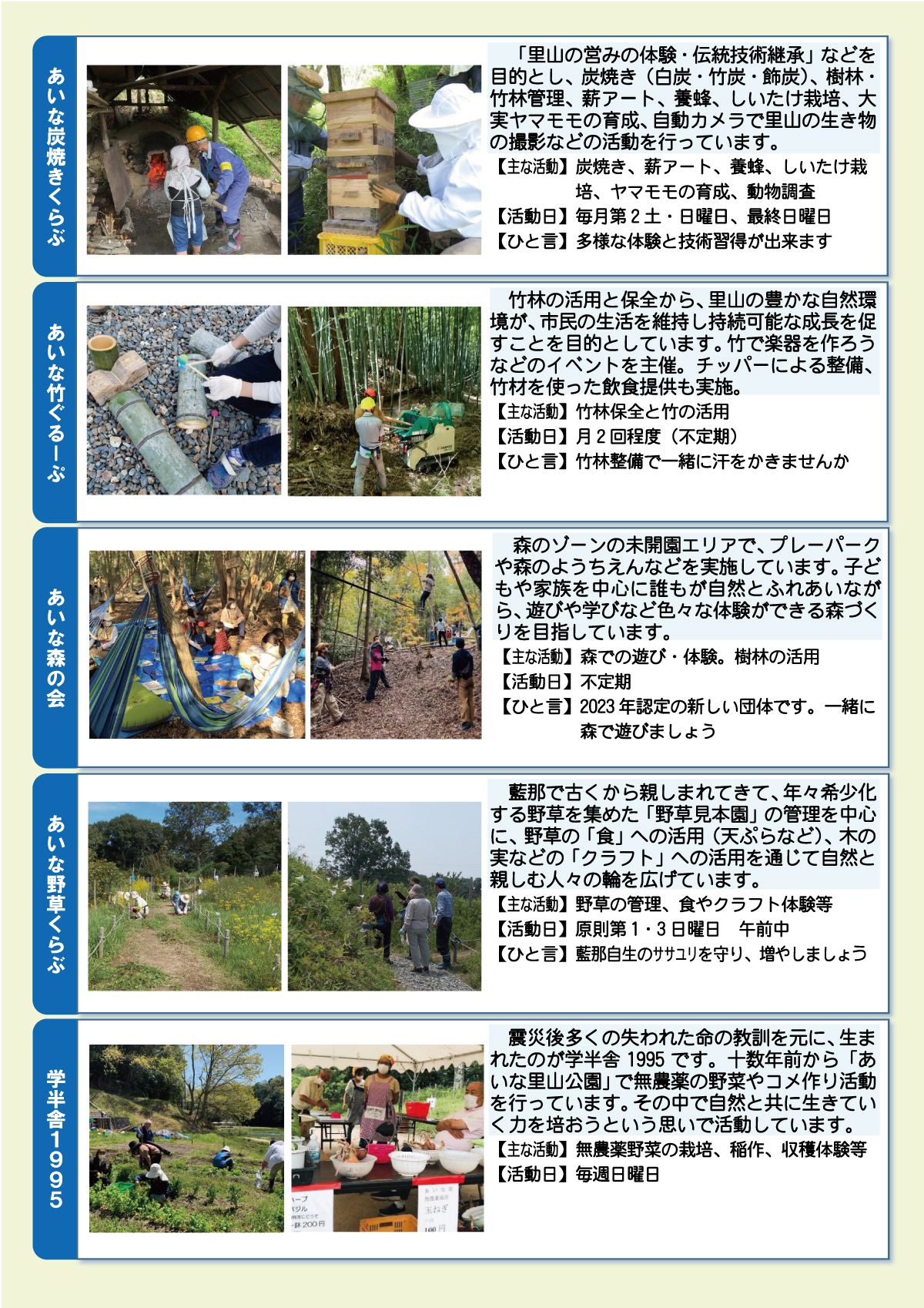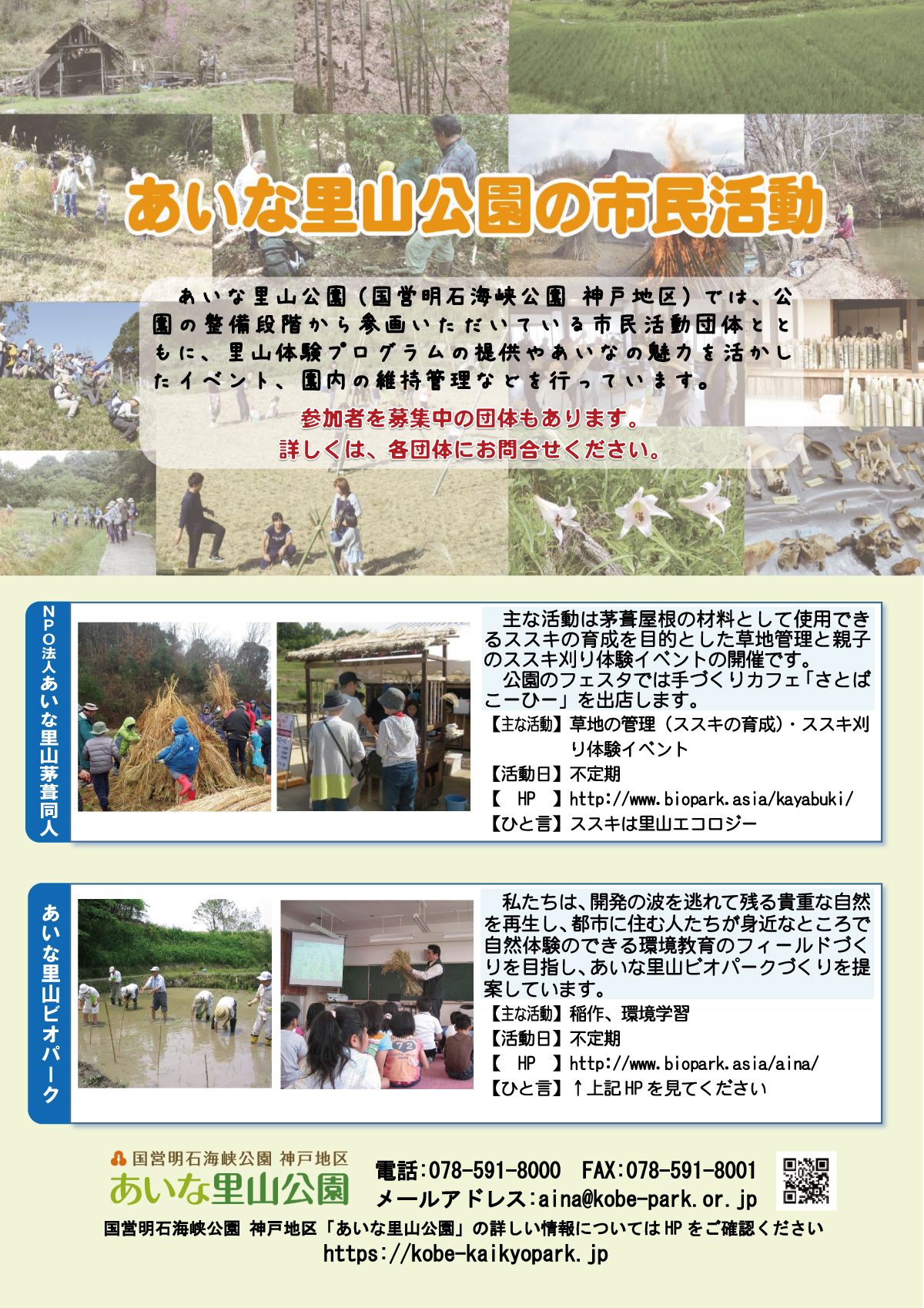 あいな里山公園では、公園の整備段階から参画いただいている市民団体とともに、園内の維持管理や地域の特性を活かしたイベントの実施、各種プログラムの提供を行っています。現在、14の市民団体の活動協力を得て、地域と一体となった公園づくりに取り組んでいます。